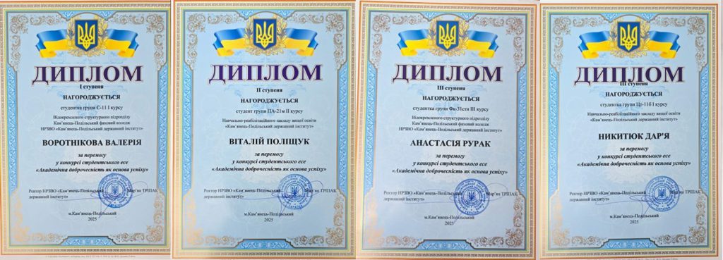 Вже четвертий рік поспіль за ініціативи Комісії з питань етики та академічної доброчесності у НРЗВО «Кам’янець-Подільський державний інститут» та ВСП Кам’янець-Подільський фаховий коледж НРЗВО КПДІ успішно проводиться конкурс студентського есе «Академічна доброчесність як основа успіху». За роки свого існування конкурс утвердився як важливий освітній та виховний майданчик, що сприяє формуванню у студентської молоді відповідального ставлення до навчання, науки та професійної діяльності.
