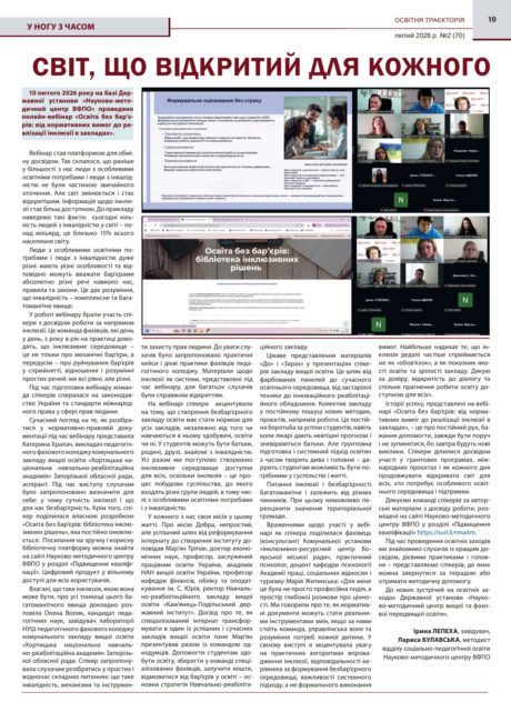 Беремо до рук черговий номер Інтерактивного інформаційного вісника «Освітня траєкторія» (випуск №2 (70) за лютий 2026 року), сучасного електронного видання, що висвітлює інноваційні освітні підходи, авторські напрацювання педагогів та сприяє обміну професійним досвідом у педагогічній спільноті, і на сторінці 10 натрапляємо на анонс «Руйнуємо бар’єри». Під цією рубрикою розміщена стаття авторок Ірини Лепехи, завідувачки відділу Державної установи «Науково-методичний центр ВФПО», та Лариси Булавської, методистки відділу соціально-педагогічної освіти Науково-методичного центру ВФПО.