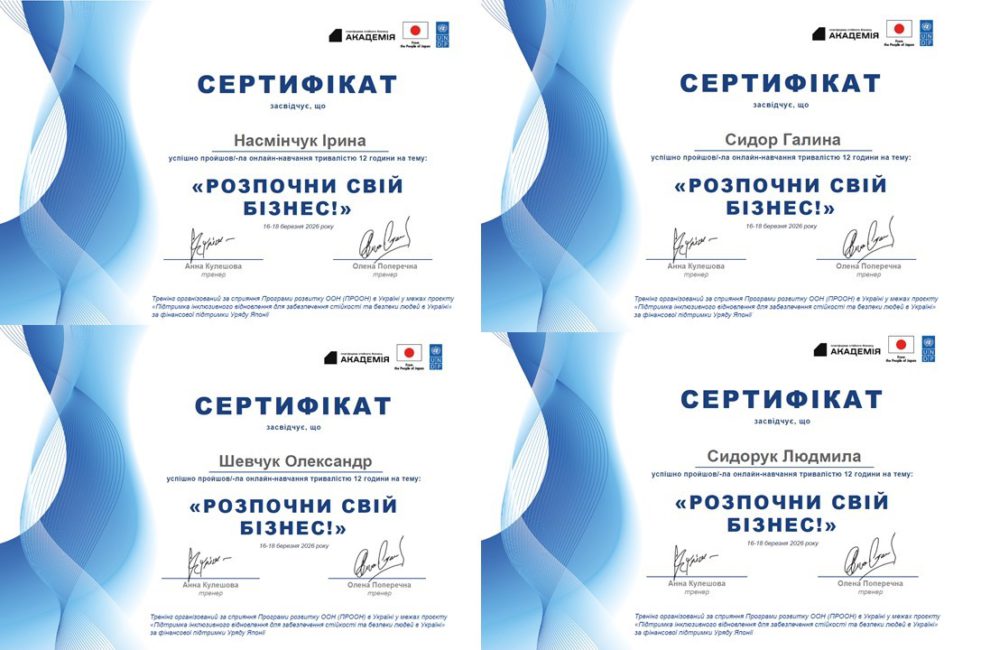 16-18 березня 2026 року викладачі кафедри цифрових, освітніх та соціо-економічних технологій факультету економіки, управління та діджиталізації Навчально-реабілітаційного закладу вищої освіти “Кам’янець-Подільський державний інститут” пройшли тренінг «Розпочни свій бізнес!», організований за підтримки Програми розвитку ООН (ПРООН) в Україні у межах проєкту, спрямованого на інклюзивне відновлення та підвищення стійкості населення, за фінансової підтримки Уряду Японії.